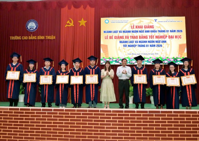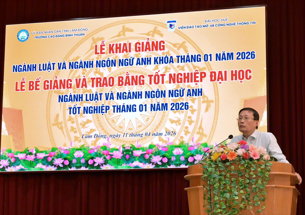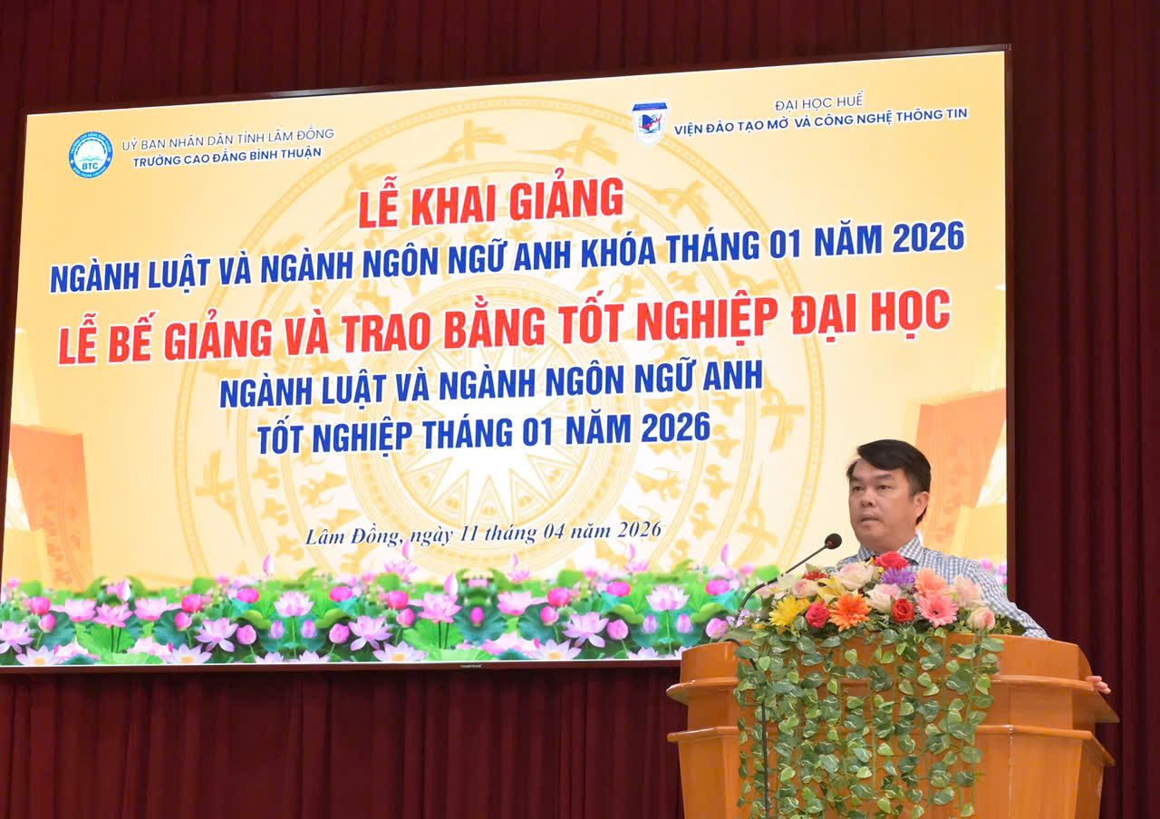 Chiều ngày 11/4/2026, Trường Cao đẳng Bình Thuận phối hợp với Viện Đào tạo Mở và Công nghệ thông tin – Đại học Huế tổ chức Lễ khai giảng các lớp đại học ngành Luật, Ngôn ngữ Anh khóa tuyển sinh tháng 1/2026, đồng thời bế giảng và trao bằng tốt nghiệp cho các tân cử nhân cùng ngành.